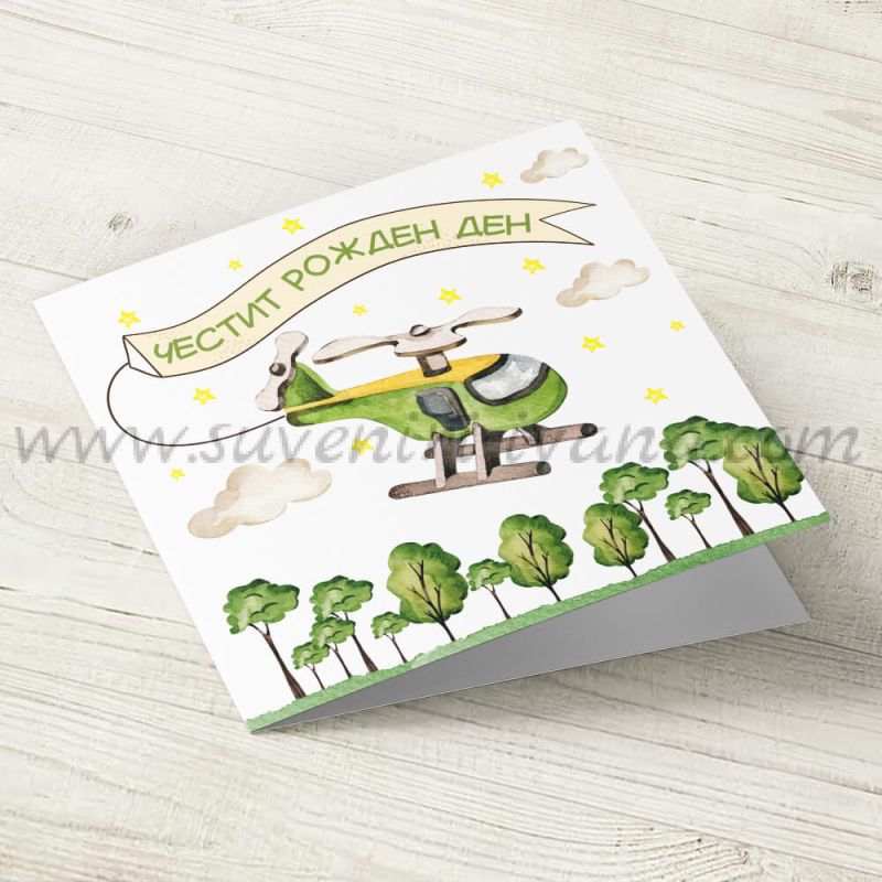Ръчно изработена поздравителна картичка с надпис 'Честит Рожден Ден', вертолет. Размери 10,0 х 9,6 см. Модел двайсет и шест.