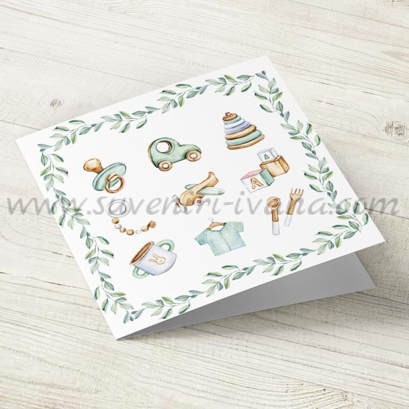 Ръчно изработена картичка подходяща за поводи свързани с раждане на бебе, рожден или имен ден.. Картичката е с акварелна илюстрация върху еко картон с ленени влакна. Размери 10,0 х 9,6 см. Модел едно.