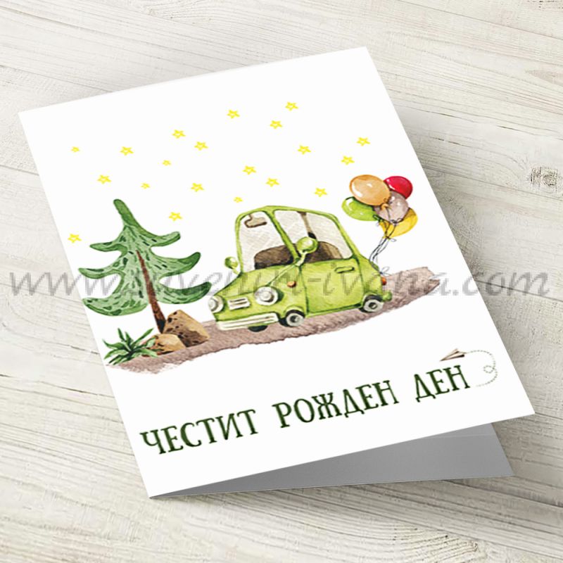 Ръчно изработена картичка с автомобил и надпис 'Честит Рожден Ден'. Картичката е с акварелна илюстрация на автомобилче върху еко картон с ленени влакна. Подходяща е за детски празници, рождени дни и други. Размери 10,0 х 15.0 см. Картичката се предлага с плик.