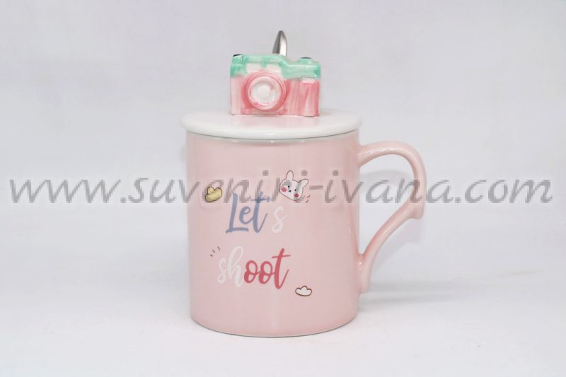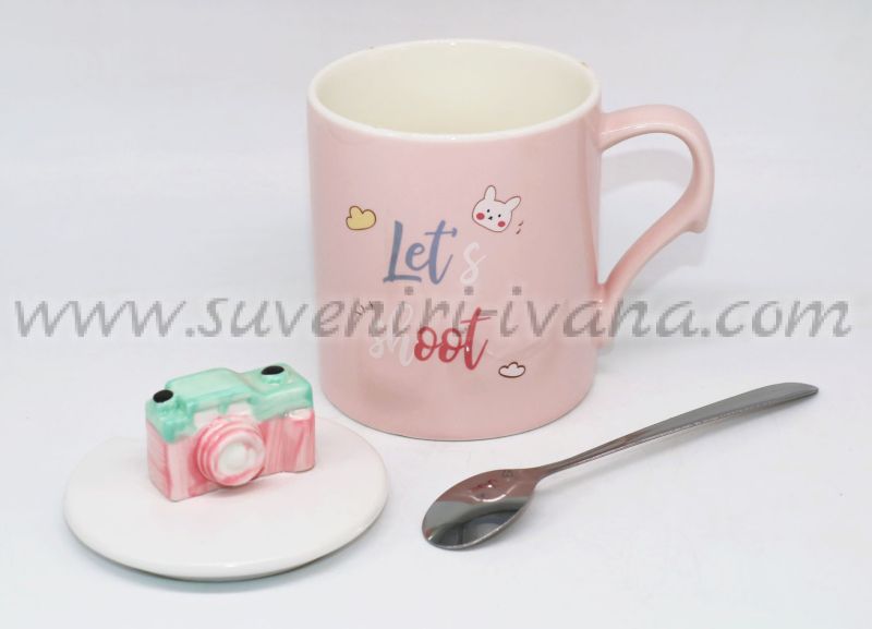Керамични чаши с цветен принт, керамично капаче, на което като дръжка отгоре има фотоапарат и метална лъжичка за разбъркване. Височина на чашата без капачето 9,5 см. диаметър в горната част 8,0 см. Вместимост 350 мл. Модел едно.