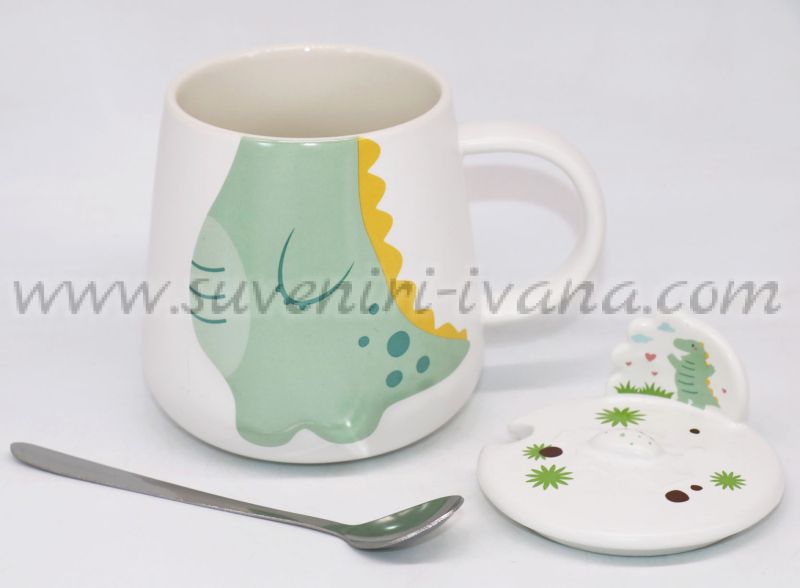 Керамична чаша с цветен принт зелено динозавърче, керамично капаче и метална лъжичка за разбъркване. Размери на чашата 10,0 х 7,5 см.