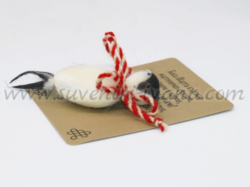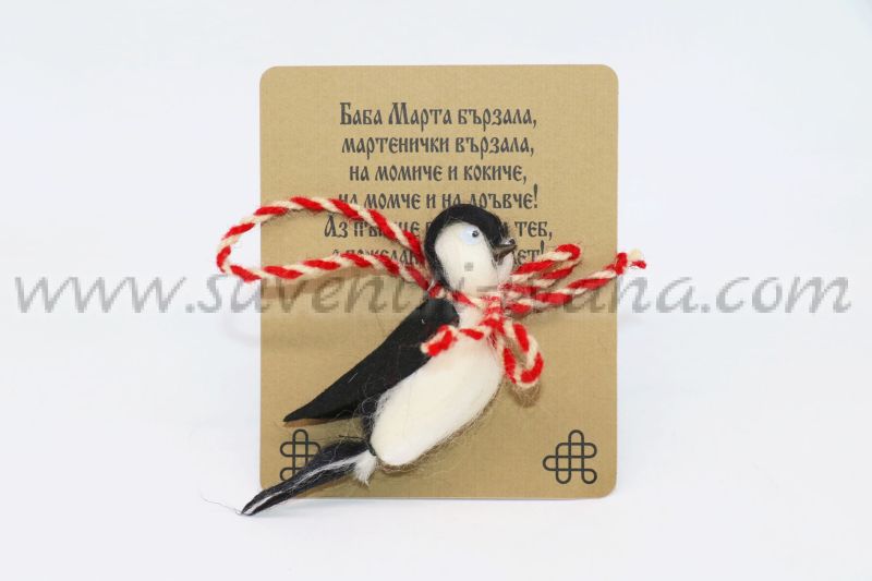 Ръчно изработена декоративна мартеница-лястовичка, подходяща за украса на дома или офиса. Мартеницата се предлага с картонче от крафт картон, на което от предната страна има стихче за Баба Марта, а от задната кратка легенда за мартеницата. Лястовичката е около 10,0 см.