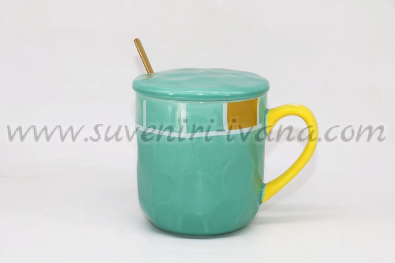 Светлосиня чаша с фигури правоъгълници, керамично капаче и златиста метална лъжичка за разбъркване. Височина на чашата 9,5 см. диаметър в горната част 8,5 см. Вместимост 380 мл.