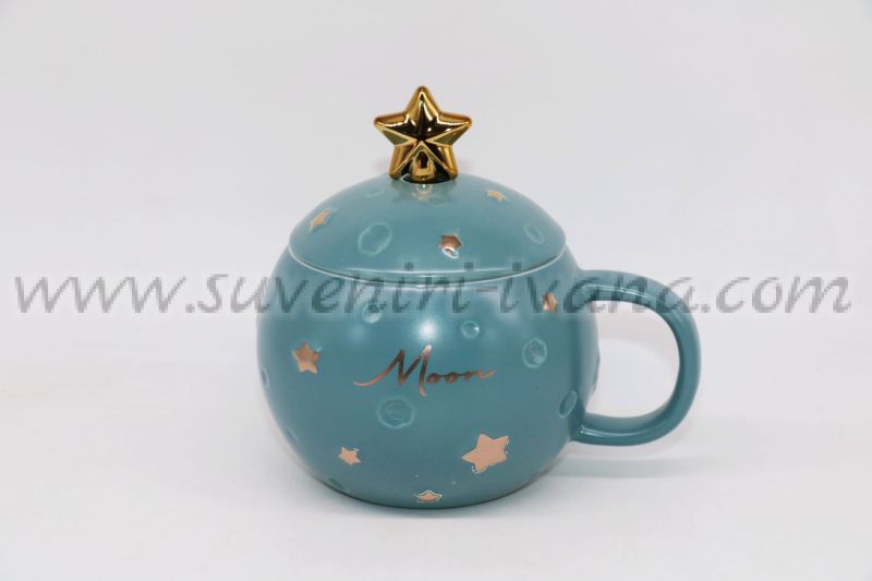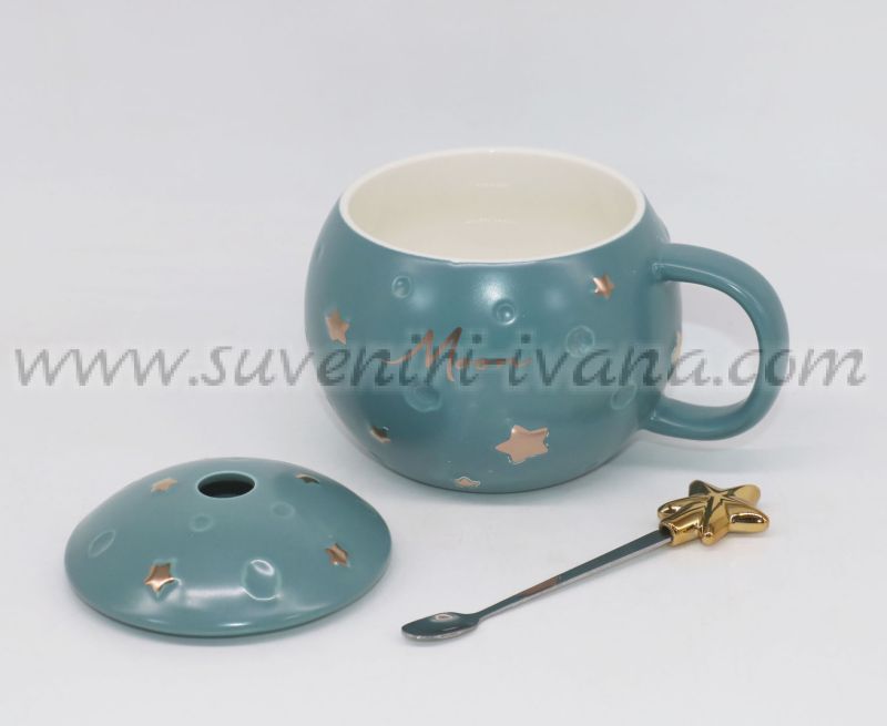 Кръгла керамична чаша серия 'Moon', модел две. Чашата е с метална лъжичка за разбъркване със звезда на дръжката и бяло керамично капаче. Височина на чашата 8,0 см. диаметър в горната част 8,5 см. Вместимост 400 мл. Други модели от тази серия чаши може да видите тук.