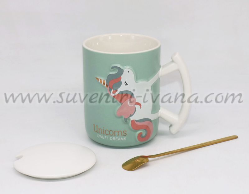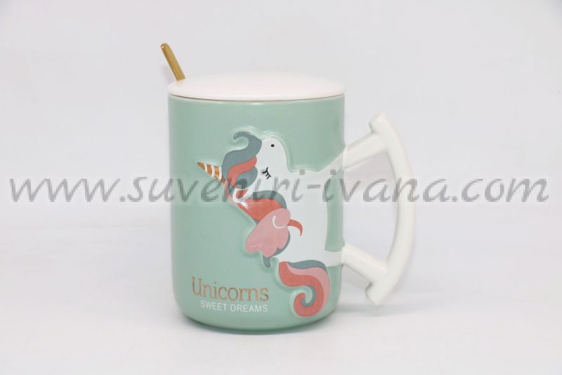 Керамични чаши с еднорози серия 'Unicorns', модел четири. Чашите са с бели керамични капачета и златисти метални лъжички за разбъркване. Височина на чашите 10,5 см. диаметър в горната част 8,0 см. Вместимост 400 мл.