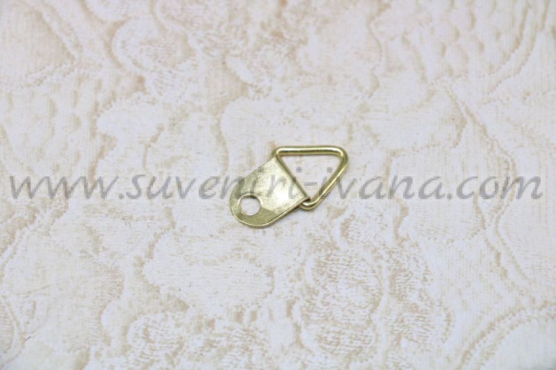 Златиста метална закачалка, подходяща за монтиране на рамки, картини, пана и други предмети за стена. Размери 23 х 13 мм.