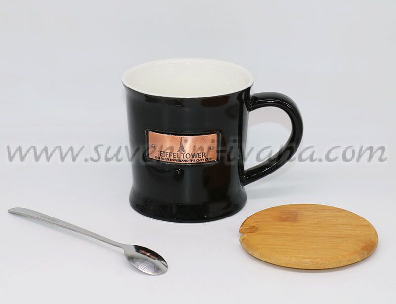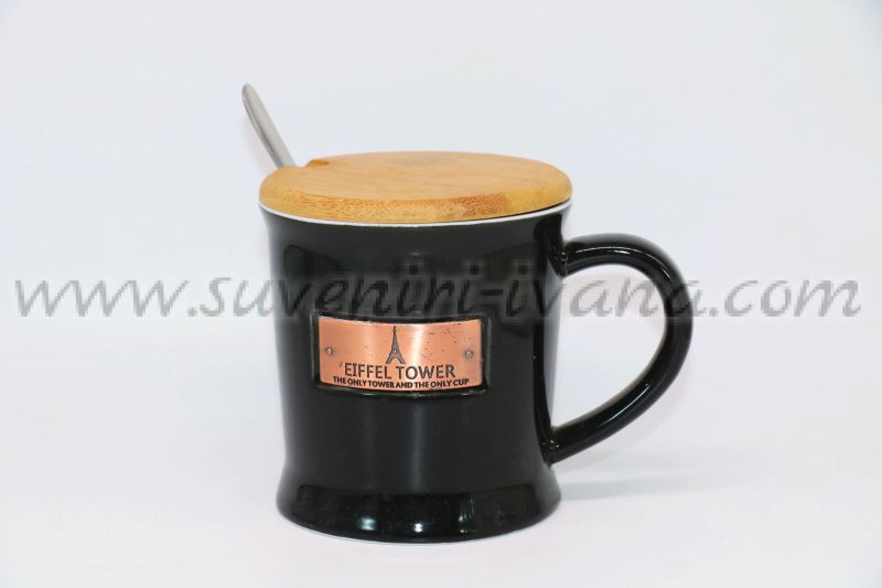 Черна керамична чаша с принт 'Eiffel Tower', бамбуково капаче и метална лъжичка за разбъркване. Размери 10,0 х 9,5 см.