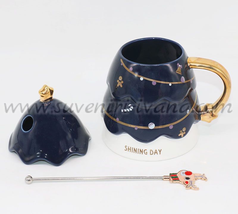 Kоледна чаша с формата на коледна елха и надпис 'Shining day', модел три. Чашата е с капаче и метална бъркалка за разбъркване с коледно еленче на дръжката.