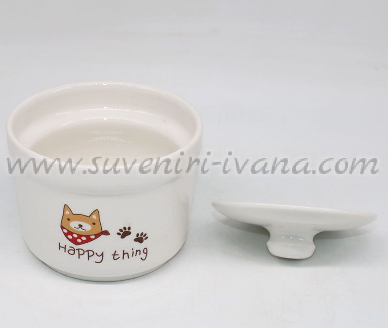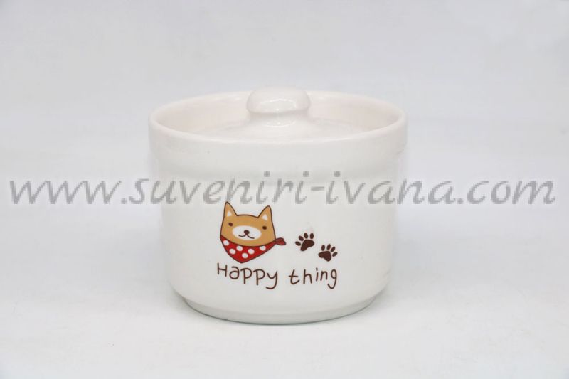 Порцеланова захарничка с цветен принт куче и надпис 'Happy thing'. Размери: височина 7,0 см, диаметър в горната част 9,8 см. Вместимост 280 мл.