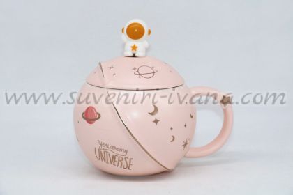 Розова чаша с цветен принт и надпис 'You are my universe'. Чашата е сферична и е с керамично капаче и метална лъжичка за разбъркване.