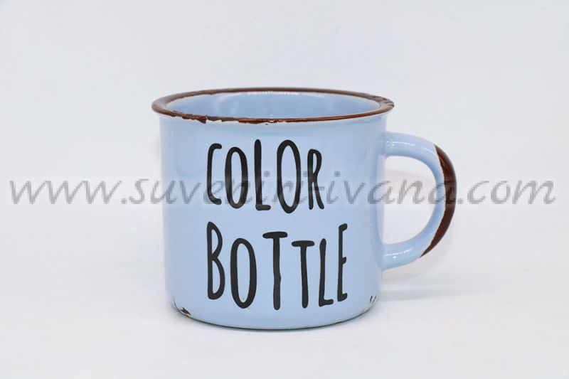 Светлосиня керамична чаша тип канче с надпис 'Color Bottle'. Подходяща е за консумиране на кафе, чай или други топли и студени напитки.
