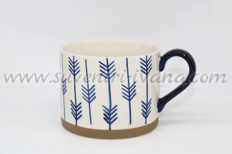Бяла керамична чаша с цветен принт сини черти. Височина на чашата 8,0 см. диаметър в горната част 10,0 см. Вместимост 400 мл.