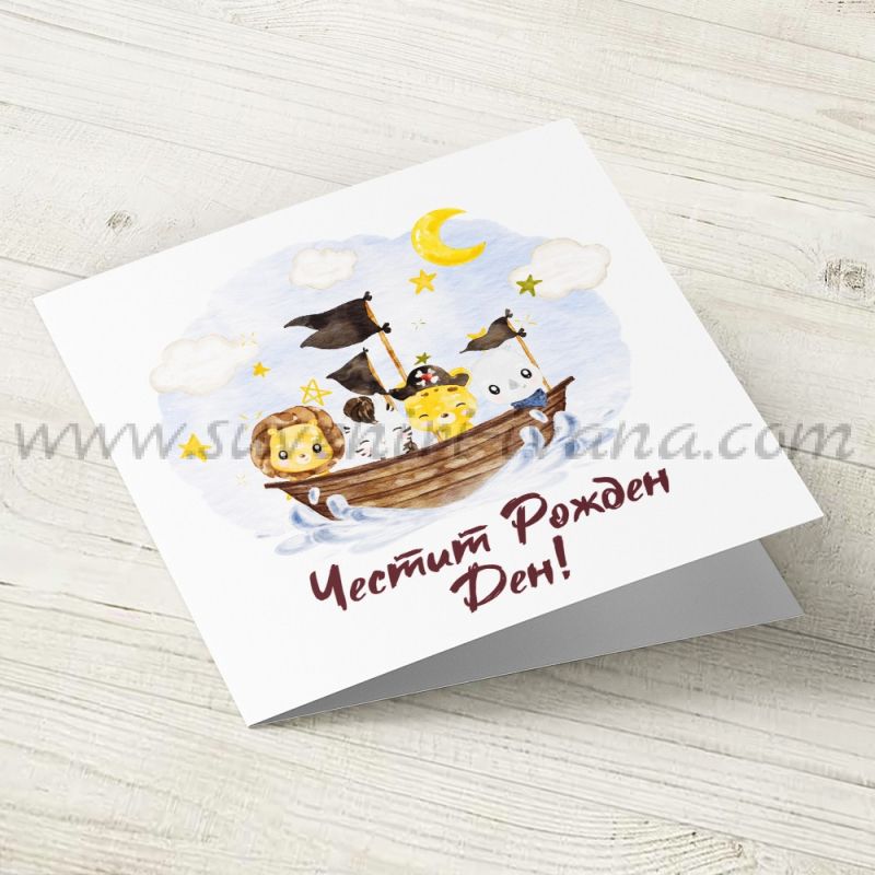 Ръчно изработена поздравителна картичка с надпис 'Честит Рожден Ден', пирати. Размери 10,0 х 9,6 см. Модел двайсет и седем.