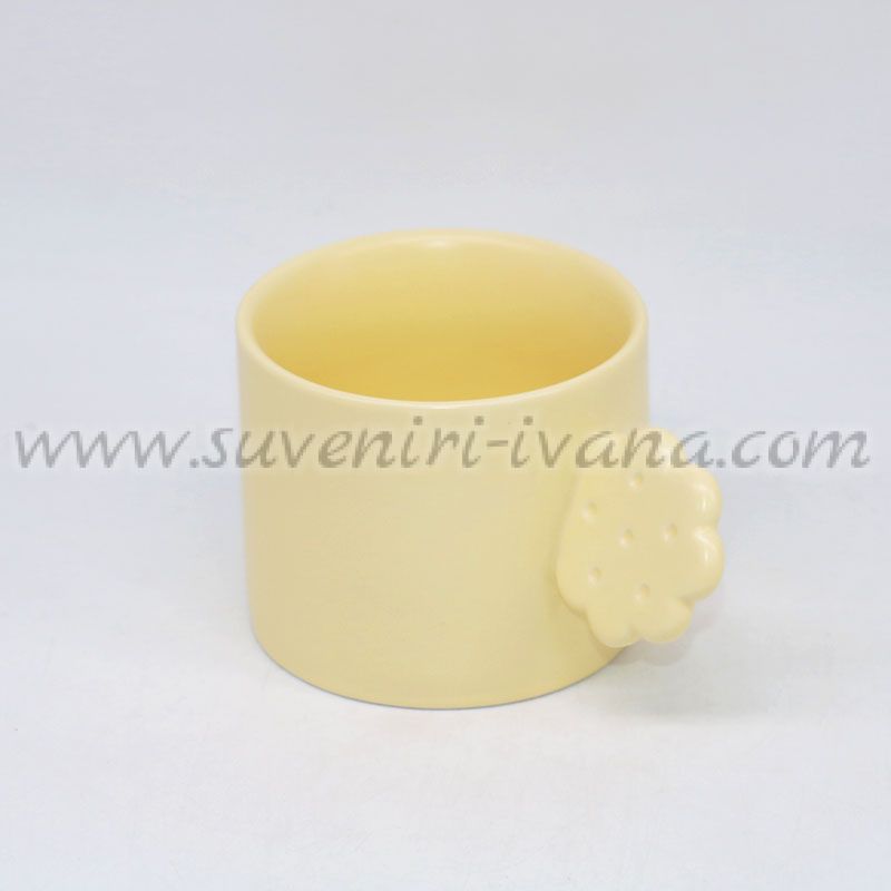 Жълта керамична чаша за чай или кафе с дръжка с формата на бисквитка. Чашата е с вместимост 250 мл.