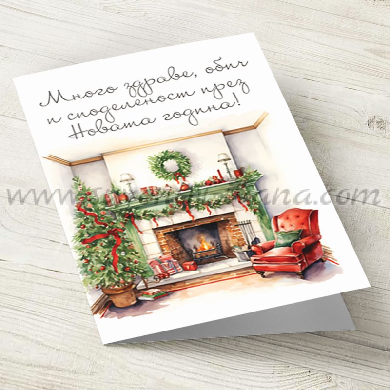 Ръчно изработена коледна поздравителна картичка с надпис 'Много здраве, обич и споделеност през Новата година'. Картичката е с размери 10,0 х 15,0 см и се предлага с плик.