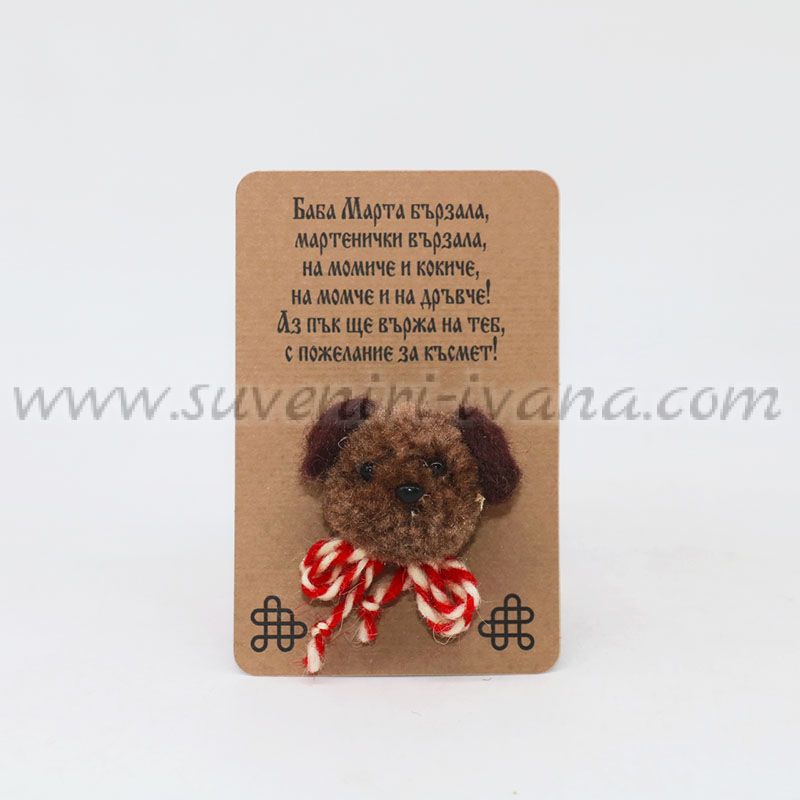 Мартеница за закачане с кученце, направено от филц. Мартеницата се предлага с картонче с първомартенско стихче от предната страна и кратка легенда за мартеницата от задната.