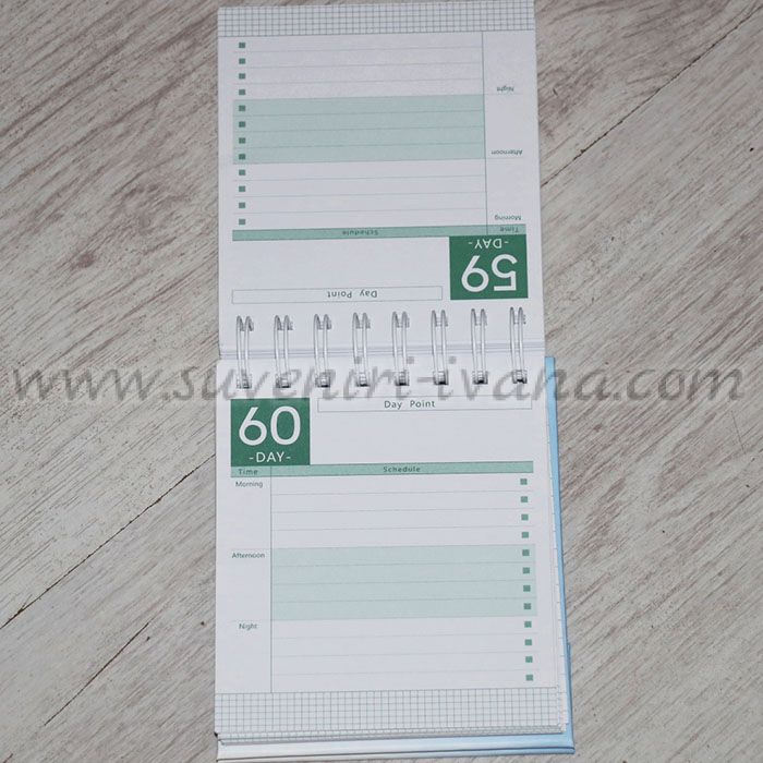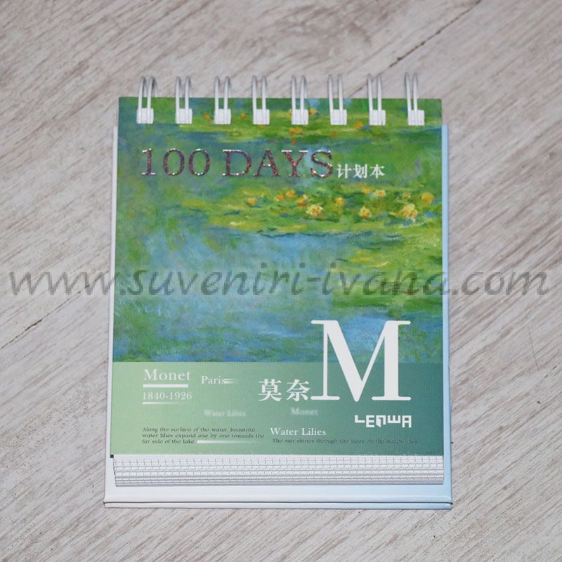 Тефтер-бележник за бюро със сто дневен планер, разграфен за сутрин, обед и вечер. На предната корица има различни картини на Моне. Модел три.