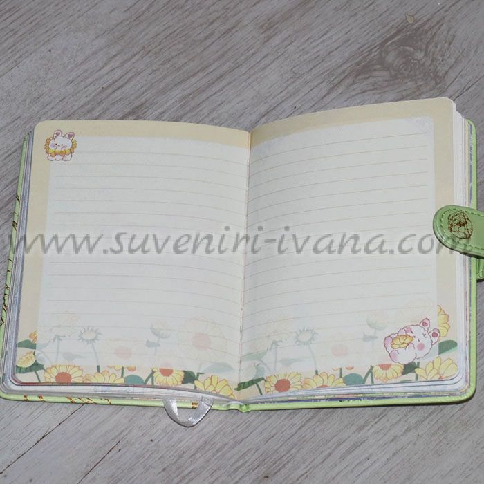 Тефтера се затваря с магнитна закопчалка. Разполага с текстилна лента за отбелязване на страниците, които са на точки, редове и квадратчета. Покритието на кориците е зашито за картона и наподобява мушама.