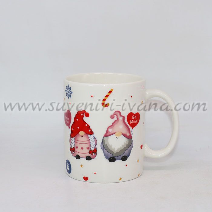 Коледна чаша с цветен принт коледни джуджета и надписи 'I love You' и 'Be mine'. Чашата е подходяща за чай, кафе и други топли или студени напитки.