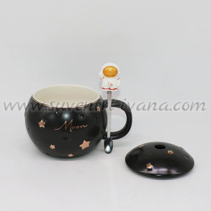 Кръгла керамична чаша със златист принт звезди и надпис 'Moon', модел две. Чашата е с капаче и метална лъжичка за разбъркване с космонавт на дръжката.