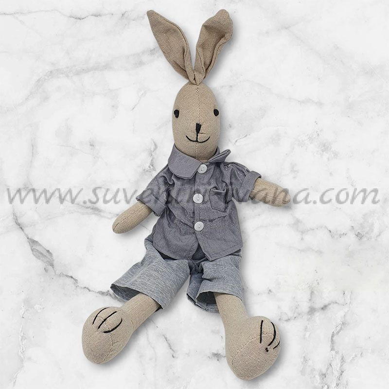 Зайче от текстил, облечено в сива ризка и панталонки. Височината на зайчето в изправено положение е около 50,0 см.