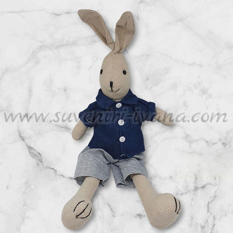 Зайче от текстил, облечено в дънкова ризка и сиви панталонки. Височината на зайчето в изправено положение е около 50,0 см.