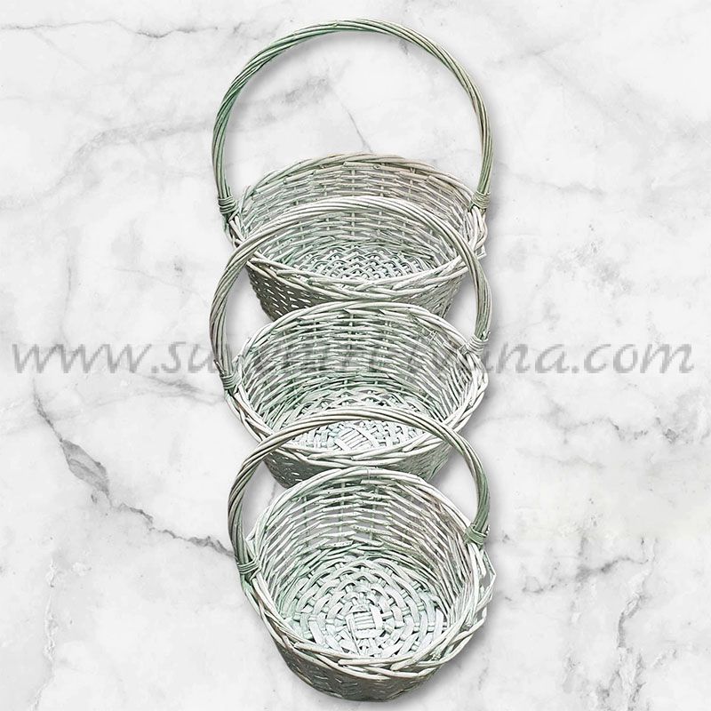 Комплект три броя плетени кошници за подаръци или декорация с кръгла форма. Изработени са от ратан и са в бледозелен цвят. Кошниците са подходящи още за цветя или за съхранение на различни продукти.