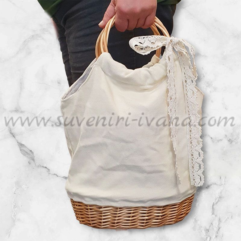 Чантата е изработена с внимание към детайла, съчетавайки ленена материя и основа от ратан. Дръжките от естествено дърво добавят допълнителен чар, а деликатната дантелена панделка придава романтичен акцент.