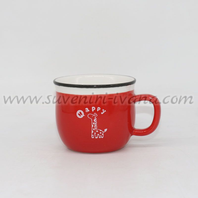 Червена керамична чаша с надпис Happy и сладка илюстрация на жираф. Подходяща за кафе, чай, мляко или горещ шоколад. Вместимост 180 мл.