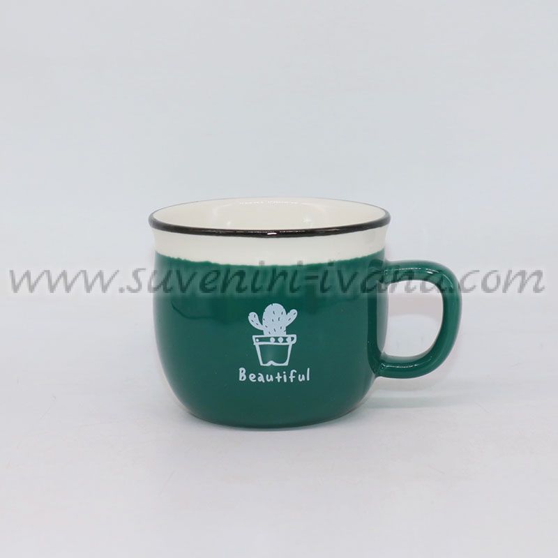 Тъмнозелена керамична чаша с надпис Beautiful и сладка илюстрация на кактус в саксия. Подходяща за кафе, чай, мляко или горещ шоколад. Вместимост 180 мл.