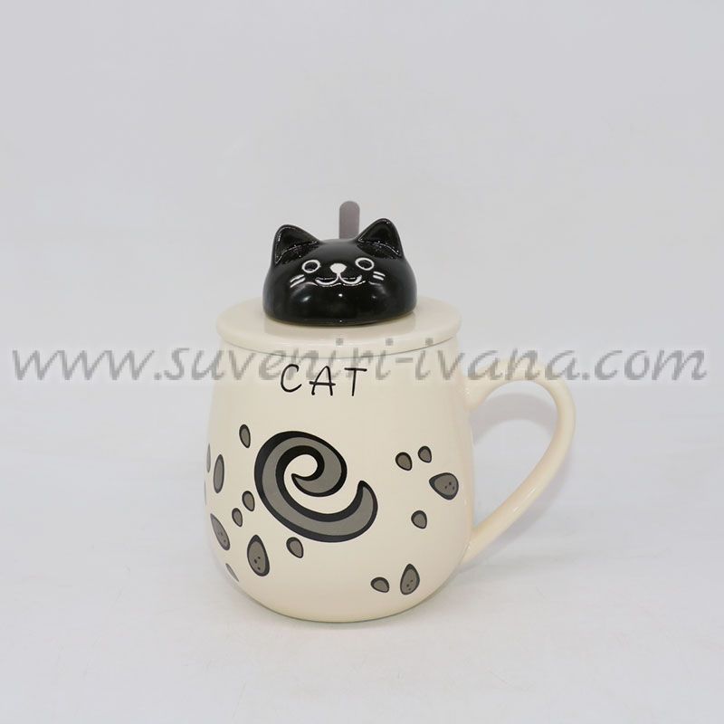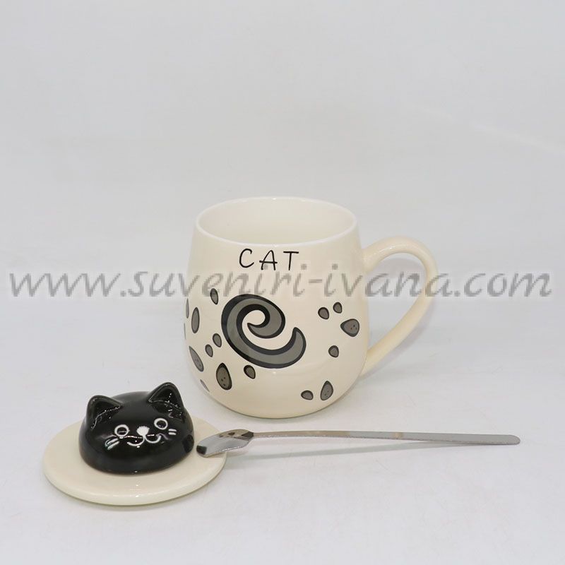 Керамична чаша с капаче коте и лъжичка, модел четири