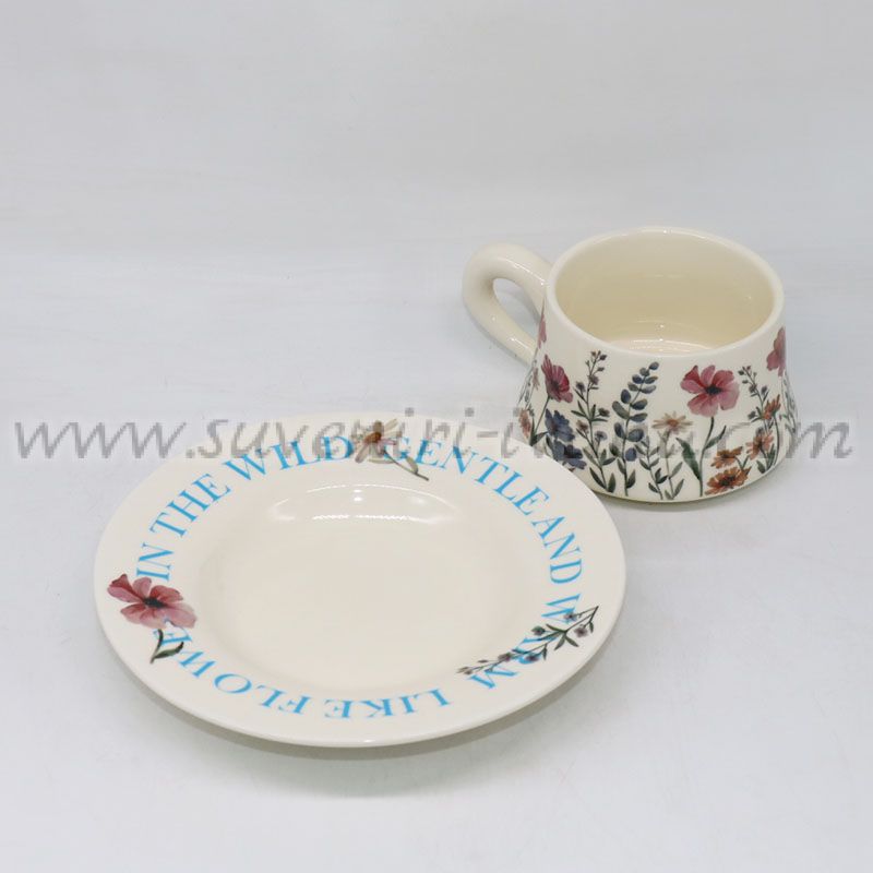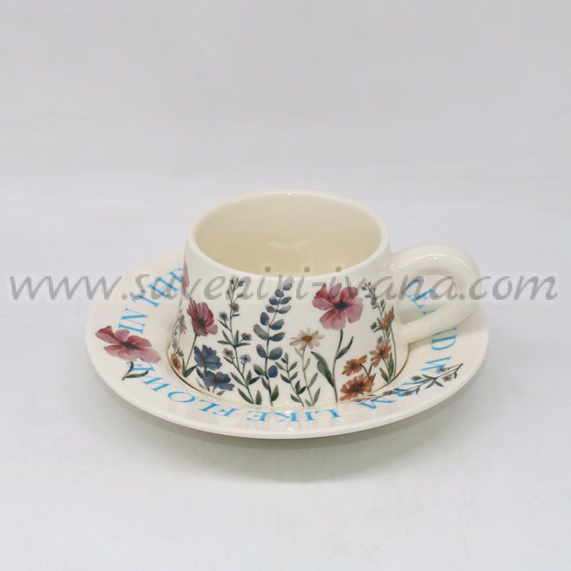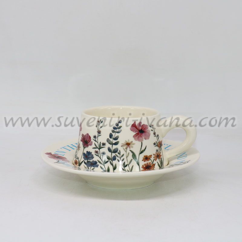 Комплект керамична чаша с красив цветен принт на цветя и чинийка с надпис Gentle and warm like flowers in the wild. Подходяща за чай, кафе, мляко и други топли напитки. Вместимост 250 мл.