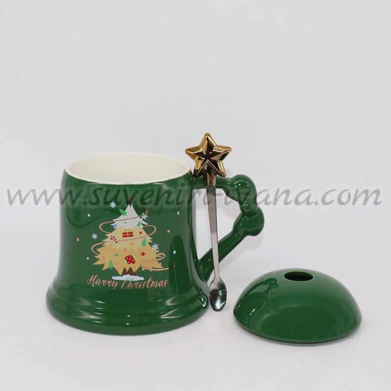 Празнична зелена керамична чаша във формата на камбанка с илюстрация на коледна елха и надпис Merry Christmas – перфектна за топли зимни напитки или коледен подарък.