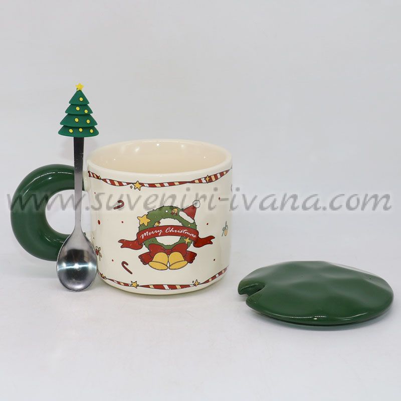 Красива коледна чаша с картинка на коледно еленче, капаче и лъжичка със силиконова фигурка елха на дръжката. Идеална за празнични сутрини и ароматен чай или кафе.