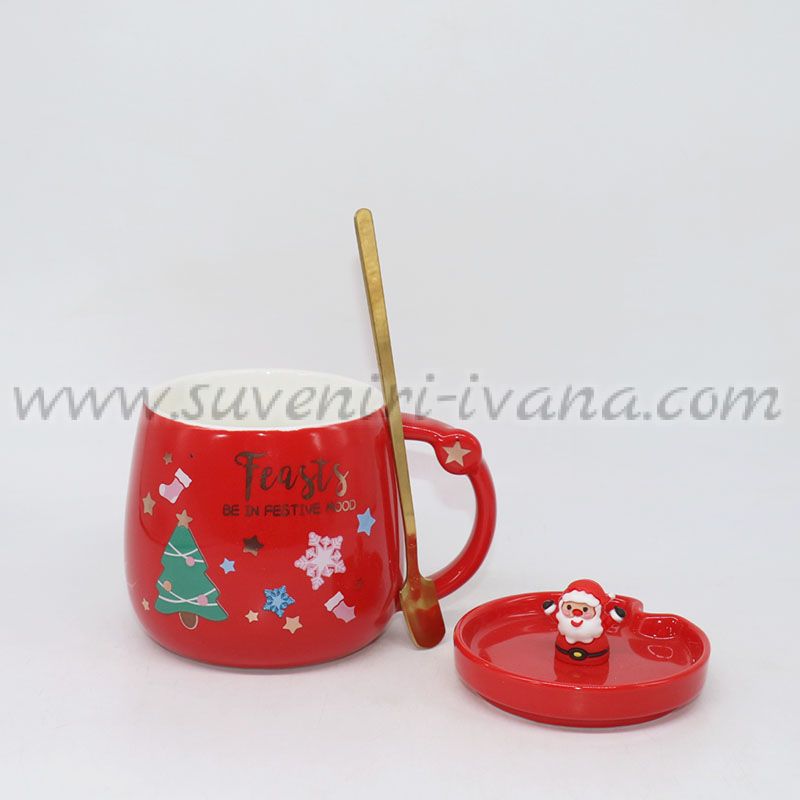 Керамична чаша украсена с коледни мотиви, капак и лъжичка - модел две