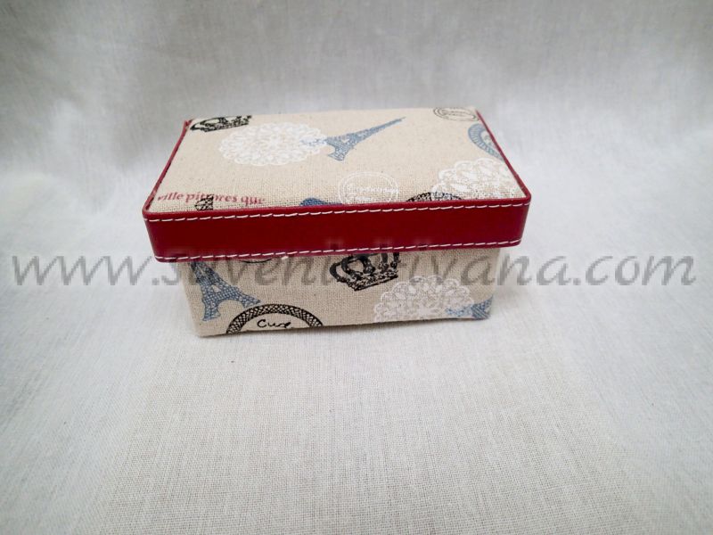 Опаковъчна кутия от твърд картон с покритие от ленено-памучен плат. Размери 14,0 х 9,0 х 7,0 см. Капака е с подплата от дунапрен и е обшит с кожен кант.