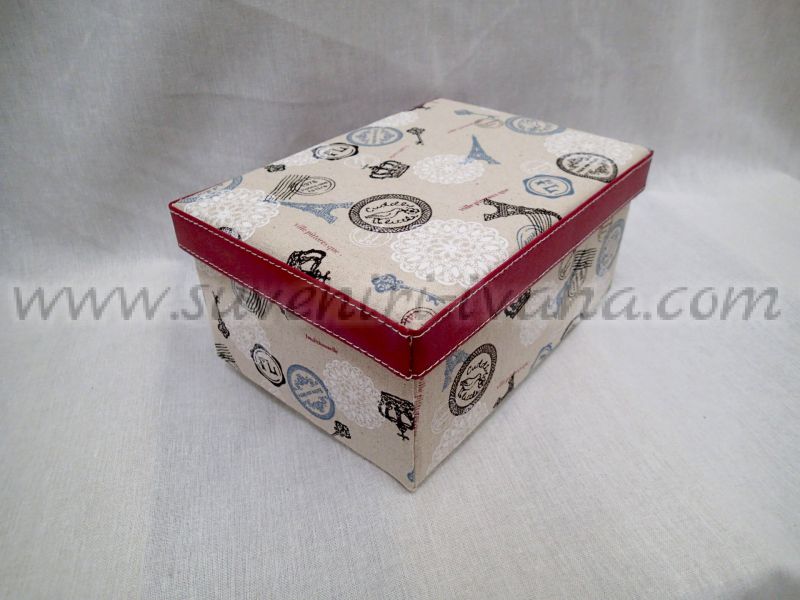 Опаковъчна кутия от твърд картон с покритие от ленено-памучен плат. Размери 25,0 х 18,0 х 11,5 см. Капака е с подплата от дунапрен и е обшит с кожен кант.