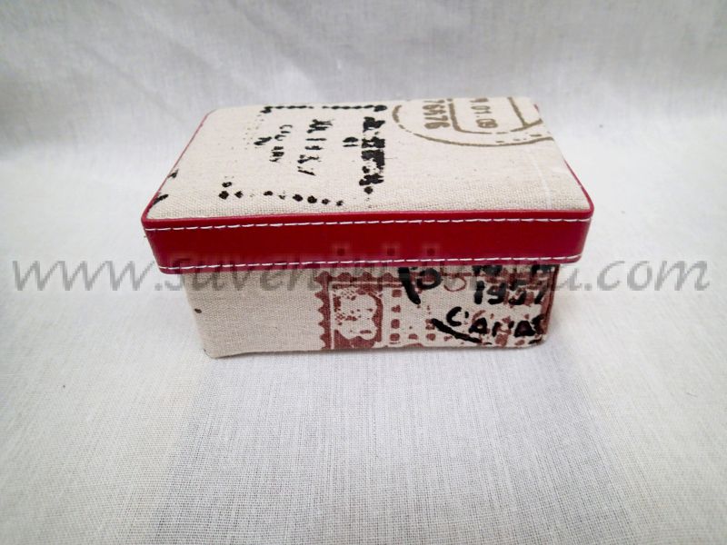 Подаръчна кутия от твърд картон с покритие от ленено-памучен плат. Размери 14,0 х 9,0 х 7,0 см. Капака е с подплата от дунапрен и е обшит с кожен кант.