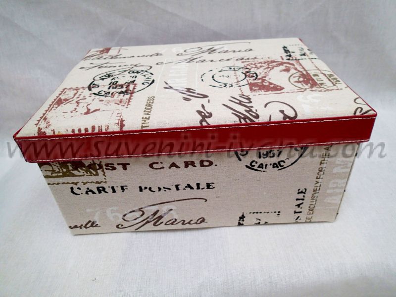 Подаръчна кутия от твърд картон с покритие от ленено-памучен плат. Размери 36,0 х 27,0 х 16,5 см. Капака е с подплата от дунапрен и е обшит с кожен кант.