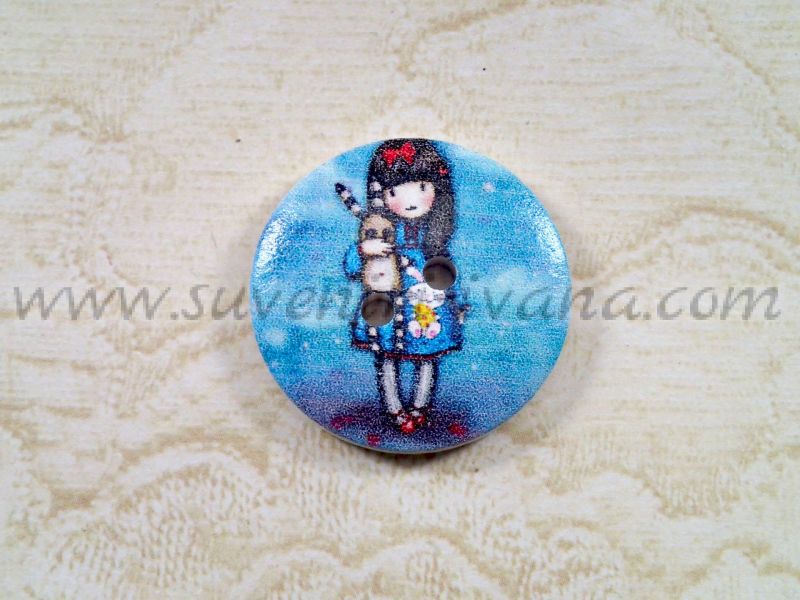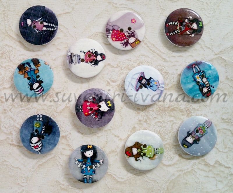 Дървени копчета с цветен принт горджъс от едната страна и бели от другата. Размер 2,5 см. комплект 12 броя различни видове.