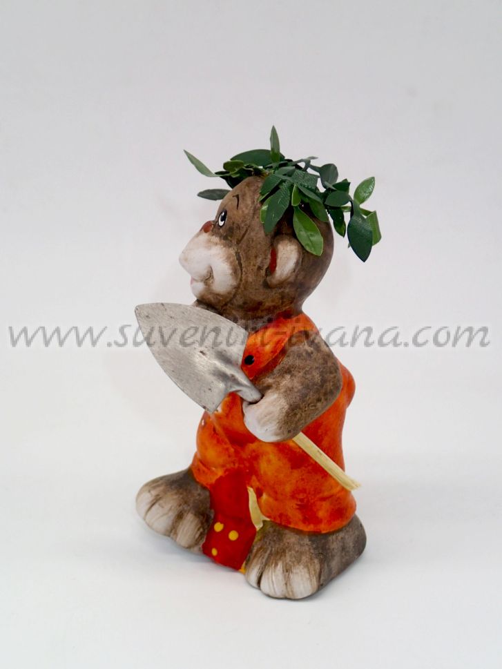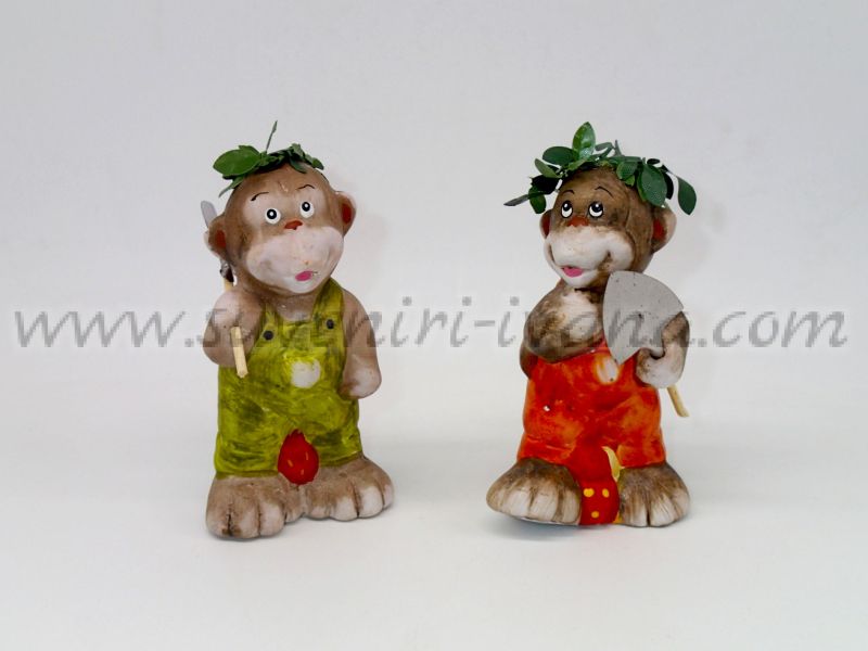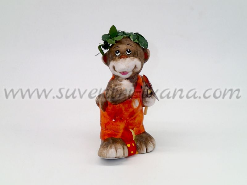 Декоративна керамична фигура маймунка с оранжев гащеризон и лопата в ръката. Размери 9,5 х 5,5 см.