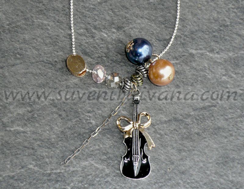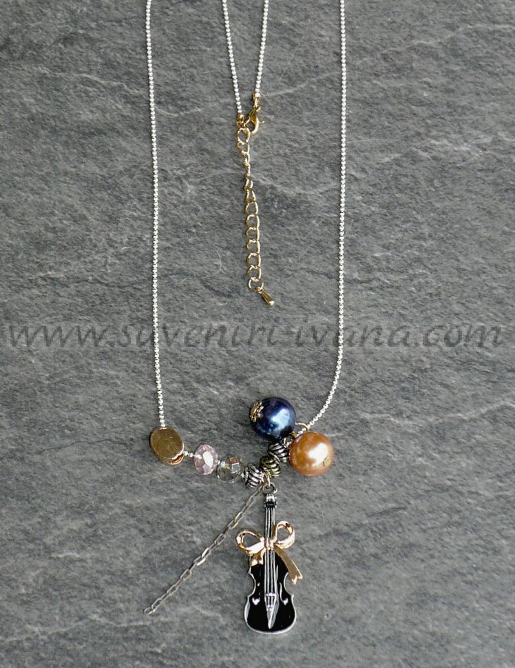 Колие в стил винтидж с елементи цигулка с панделка, перли и мъниста. Размер на цигулката 4,0 х 1,5 см. Метална верижка с дължина 40,0 см. цвят златист.
