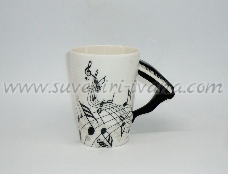 Порцеланова чаша за чай или кафе с ноти и дръжка на музикален инструмент с формата на пиано. Размери 10,0 х 7,5 см. Вместимост 220 мл. Разгледайте и други чаши с музикални мотиви.