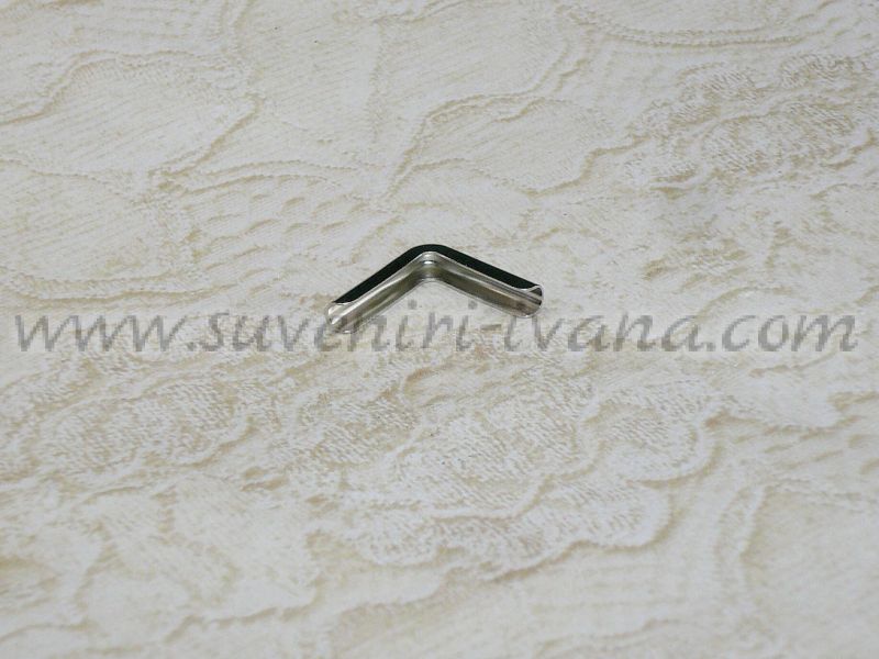 Метален елемент ъгъл за декорация или обков на корици, цвят сребро. Размери 1,6 х 1,6 х 0,2 см.