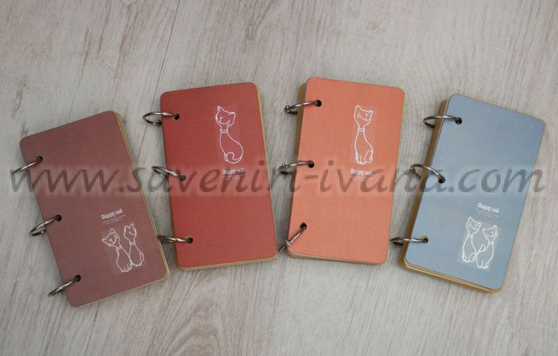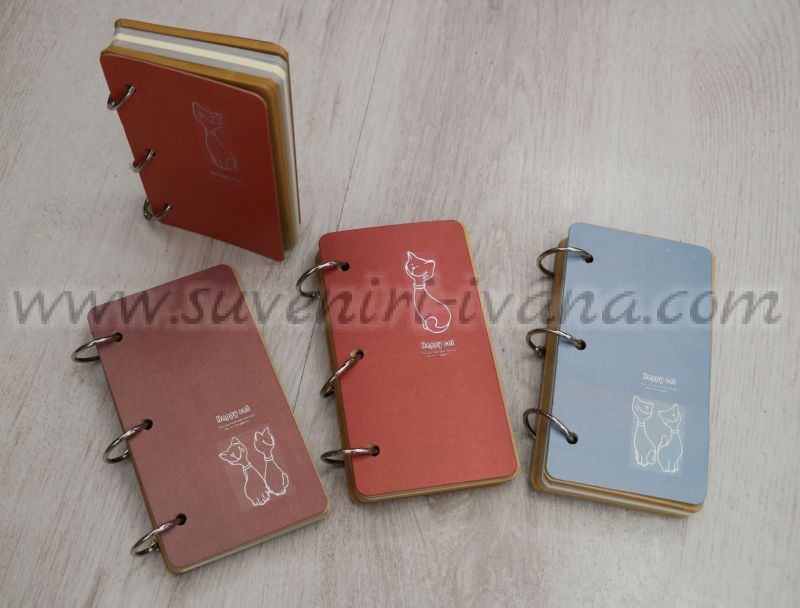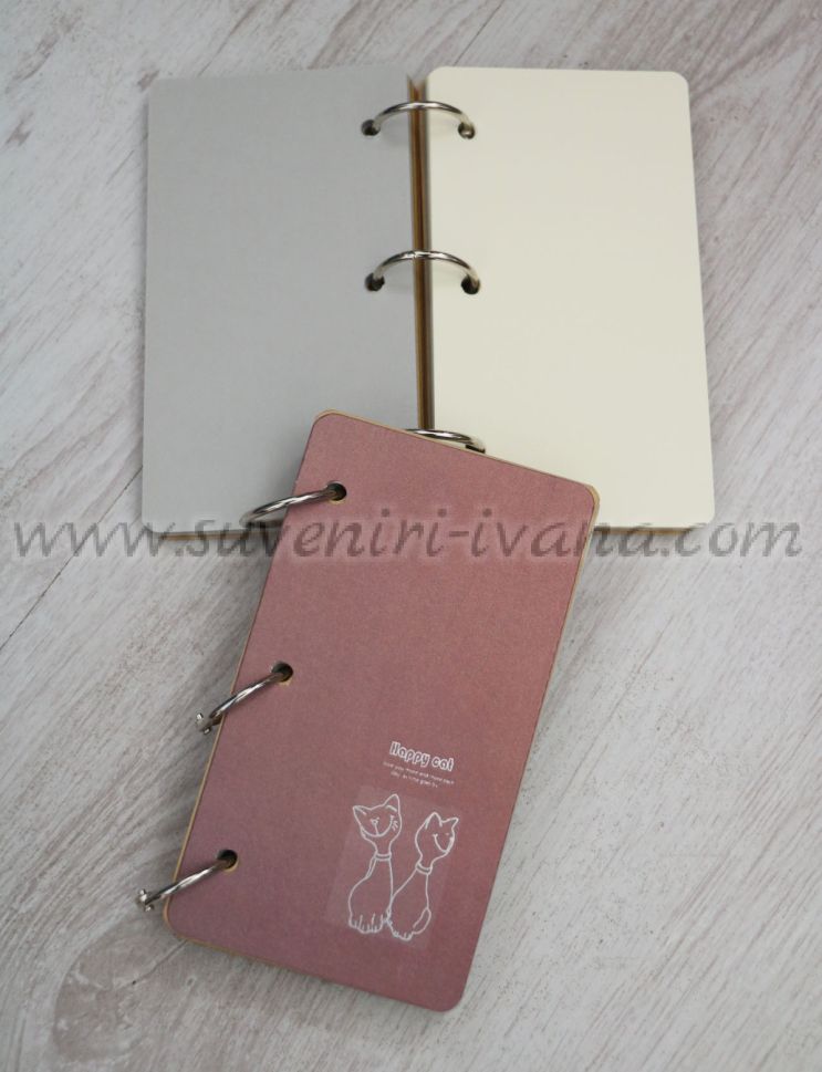 Винтидж тефтер от серията 'Happy cat' с метални халки. Размери 8,0 х 14,5 см. Страниците са едноцветни, изчистени и са от рециклирана хартия. Халките се отварят и могат да се махат.