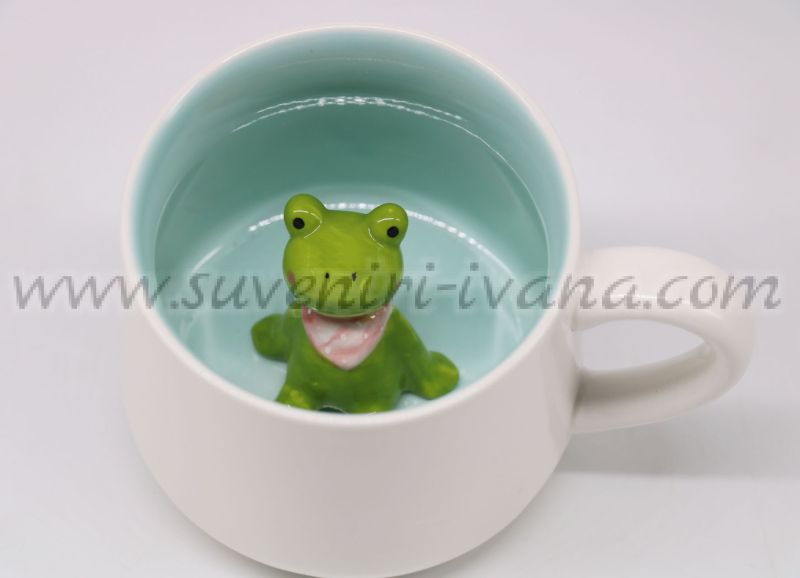 Бяла чаша със зелена керамична фигурка жаба на дъното. Височина на чашата 8,0 см. диаметър в горната част 9,0 см. Вместимост 380 мл.