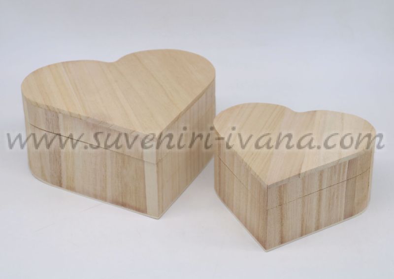 Натурални дървени кутии сърце, комплект два броя. Размери: голяма - 16,5 х 15,5 х 7,5 см. малка - 13,0 х 12,5 х 6,0 см. Кутиите са с магнитно затваряне. Подходящи за декориране и обработване чрез прилагане на различни арт техники.