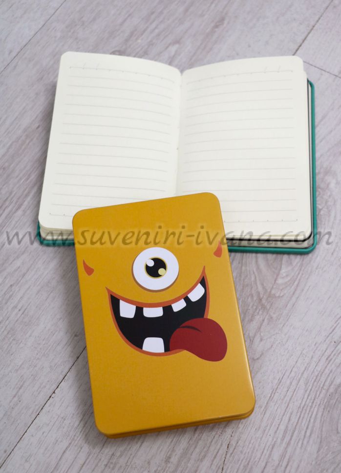 Тефтер в стил винтидж с жълти метални корици и забавна физиономия на чудовище от двете страни. Модел едно. Страниците на тефтера са няколко вида - на редове, на квадратчета, изчистени и страници в черен цвят. Брой страници 224. Размери на тефтера 10,0 х 15,0 см.