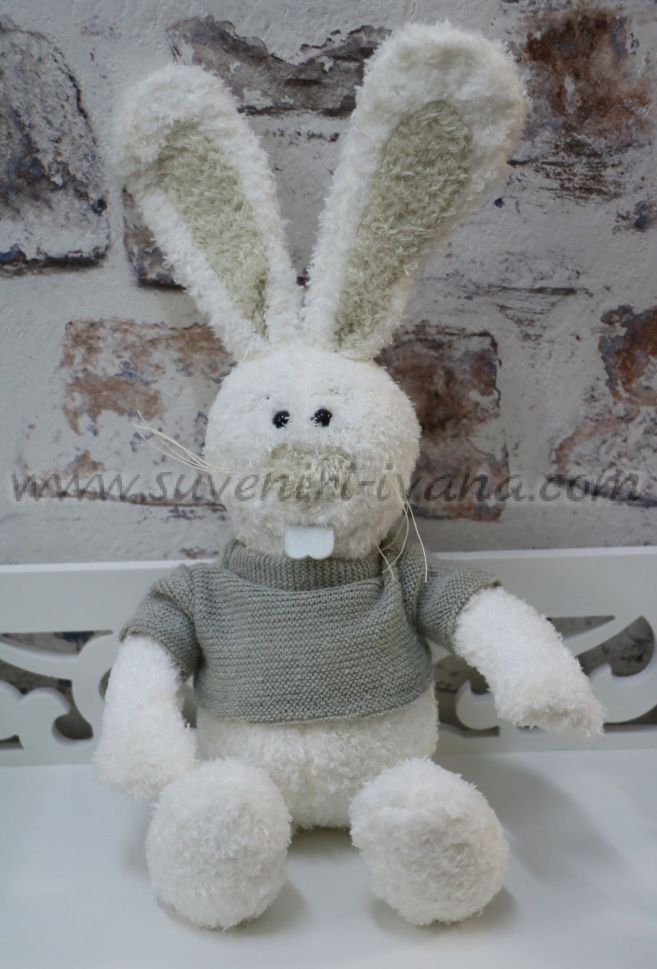 Играчка от текстил зайче, изработено от мек плюшен плат, облечено със сиво пуловерче. Зайчето е с пълнеж от силиконова вата и е подходящо както за игра, така и за декорация. Приблизителни размери 40,0 х 15,0 см. Модел две.