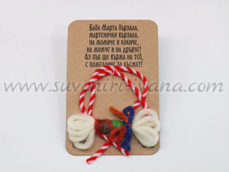 Мартеница за ръка, ръчно изработена от преплетени различни цветове прежда. Мартеничката се предлага в целофанено пликче и картонче с първомартенско стихче от предната страна и кратка легенда за мартеницата от задната.